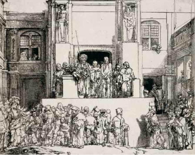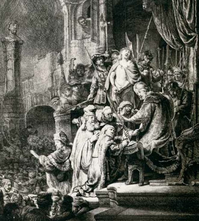 在伦勃朗全部版画中最完满的当推那幅巨型的《耶稣受审》。贵族们向统治者彼拉多(Pontius Pilate)要求把耶稣处刑。群众在咆哮,在大声呼喊。彼拉多退让了,同时声明他不负判决耶稣的责任。一切的枝节,在此还是值得我们加以精细的研究。彼拉多那副没有决断的神气,的确代表那种不愿多事的老人。他宛如受到群众的威胁而失去了指挥能力的一个法官。在他周围的一切鬼怪的脸色上,我们看出仇恨与欲情。