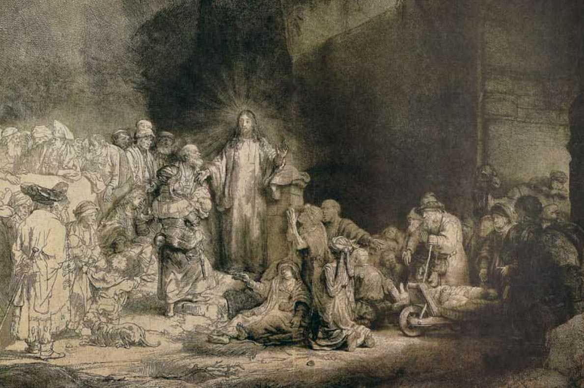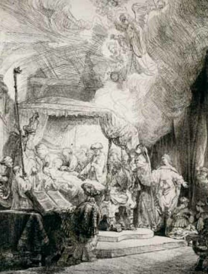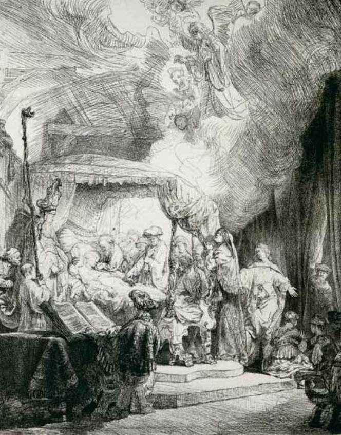 右侧是婴儿群。一个母亲在耶稣脚下抱着她的孩子;这是一个青年妇人,梳着奇特的发髻,为伦勃朗所惯常用来装饰他的人物的。在她周围还有好几个,都在哀求与期待的情态中。