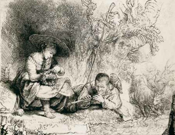 《吹笛子》,蚀刻铜版画,1642年,11.6cm×14.3cm