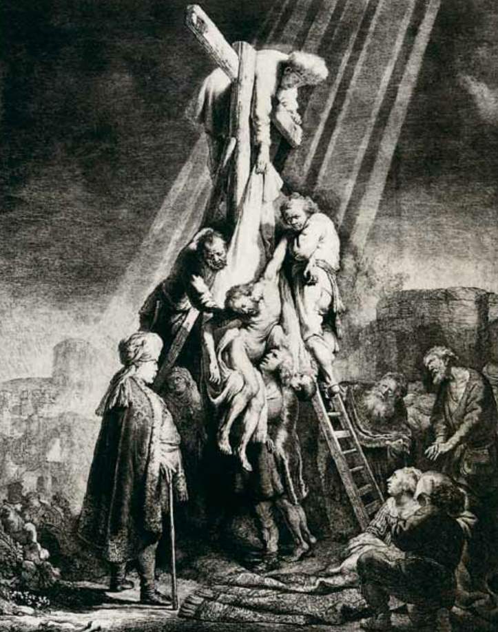 技巧更熟练但布局上没有如此大胆的,是《基督下十字架》(已死的耶稣被信徒们从十字架上释放下来)一画。在研究人物时,我们可以看到伦勃朗绝无把他们理想化的思虑。他所描绘的,是真的扛抬一具死尸的人,努力支持着不使尸身堕在地下。至于尸身,亦是十分写实的作品。十字架下,一个警官般的人监视着他们的动作。旁边,圣女们——都是些肥胖的荷兰妇人——在悲苦中期待着。但在这幕粗犷的景象中,几道白光从天空射下,射在基督的苍白的肉体上。