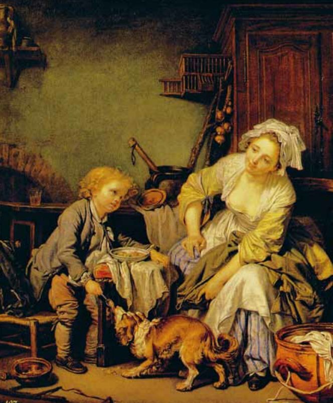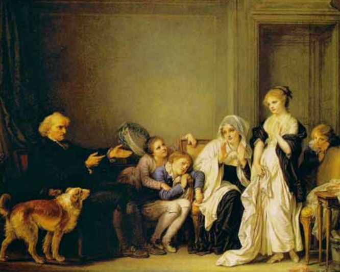 1755年,格勒兹(Greuze)三十岁。这是大艺术家天才怒放的年龄。格勒兹满怀踌躇着他的成功来得如是迟缓,他决心和官家艺术与传统决绝了。他制作了一张题材颇为奇特的画:《一个家长向儿童们读<圣经>》。图中画着整个家庭,母亲、孩子、犬,围绕着在谈《圣经》的老父。全景笼罩着一股亲切淳厚的气氛。那时代距卢梭发表中选第雄学院论文刚好六年,那年上卢梭又发表他的《民约论》。这是一个崭新的世界慢慢地开展的时代。