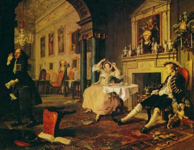 贺加斯:《婚姻组画之二·清晨》,布面油画,1743-1745年,69.6cm×90.8cm
