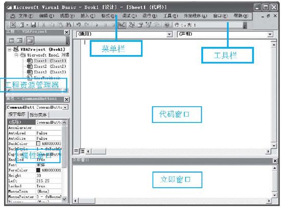 进入VBE后,首先看到的就是VBE的主窗口,主窗口通常由【工程资源管理器】、【属性窗口】、【代码窗口】、【立即窗口】、【菜单栏】和【工具栏】组成,如图2-8所示。