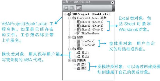 在【工程资源管理器】中可以看到所有打开的Excel工作簿和已加载的加载宏,一个Excel的工作簿就是一个工程,工程名称为“VBA Project(工作簿名称)”。【工程资源管理器】中最多可以显示工程里的4类对象,即Excel对象(包括Sheet对象和ThisWorkbook对象)、窗体对象、模块对象和类模块对象,如图2-10所示。