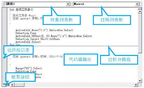 【代码窗口】由对象列表框、过程列表框、边界标识条、代码编辑区、过程分隔线和视图按钮几部分组成,如图2-11所示。