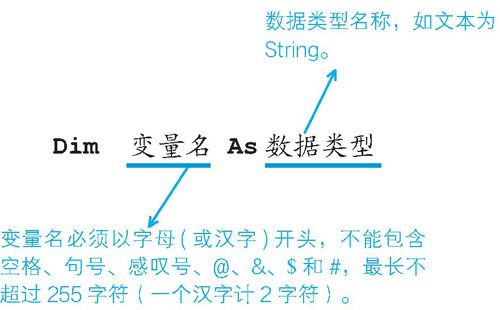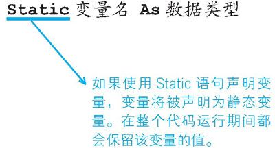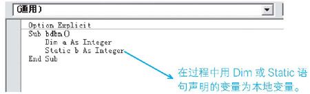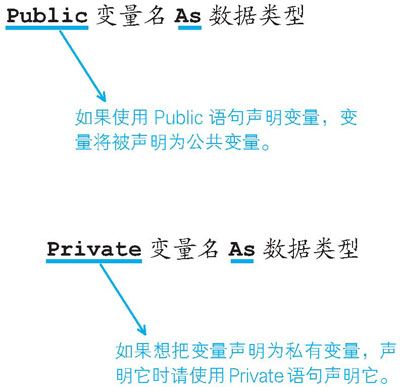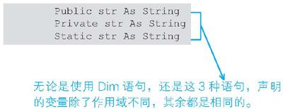 作用域 | 描述 | 单个过程在一个过程中使用Dim或Static语句声明的变量,作用域为本过程,即只有声明变量的语句所在的过程可以使用它。这样的变量称为本地变量单个模块在模块的第一个过程之前使用Dim或Private语句声明的变量,作用域为声明变量的语句所在模块里的所有过程,即该模块里所有的过程都可以使用它。这样的变量称为模块级变量所有模块在一个模块的第一个过程之前使用Public语名声明的变量,作用域为所有模块,即所有模块里的过程都可以使用它。这样的变量称为公共变量图3-7~图3-9所示为不同类型的变量的声明语句。