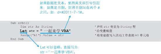 如果给文本、数值、日期等数据型变量赋值,语句为: