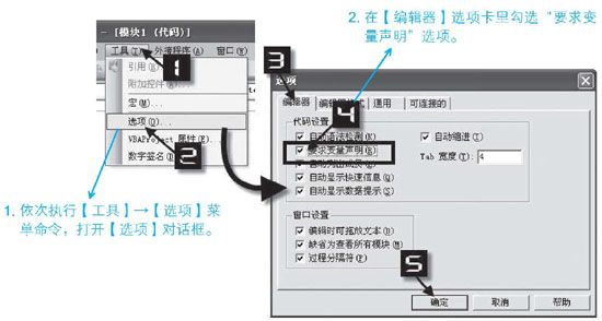 方法二:按图3-6所示设置完成后,VBA会在每个模块的第一句自动写下“Option Explicit”而无需用户手动输入。