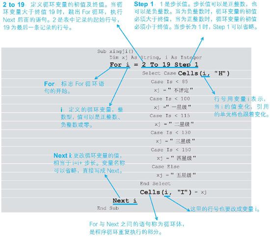 老师给小丽的程序是这样的:首先定义循环变量i的初值和终值分别是2和19,当程序执行到For语句时,判断变量i的值是否大于终值19,如果不大于,则执行For和Next中间的语句,直到Next语句,再返回For语句处再次进行判断,直到循环变量的值大于终值19,退出循环,执行Next后面的语句。