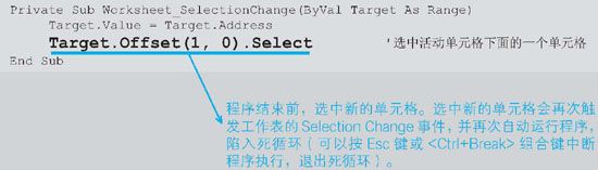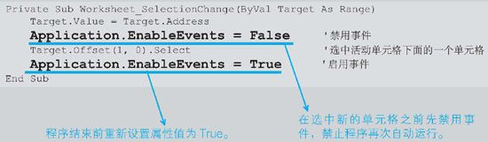设置EnableEvents属性为False后,当选中单元格后,Excel不会再自动运行程序,即禁用了该事件。
