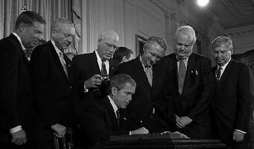 2001年10月26日,布什总统签署《爱国者法案》。(图片来源:The White House/Eric Draper)
