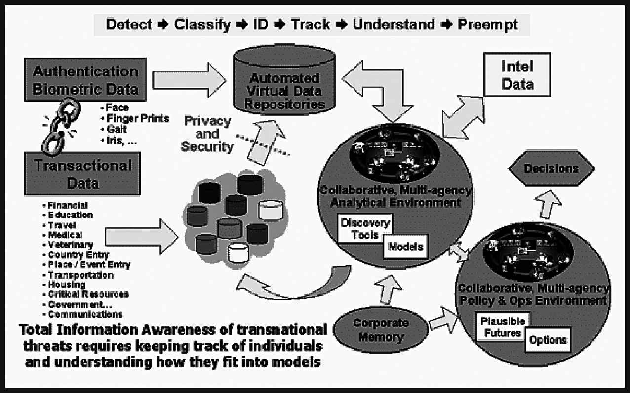 “这种新的数据资源就是‘交易空间’(Transaction Space)。如果恐怖分子要计划、执行一次恐怖活动,他们必定会在信息空间中留下某种‘数据脚印’。也就是说,他需要‘交易’,这种交易的数据记录,可以是通讯、财务、教育、医疗,也可以是旅行、交通、出入境、房屋等等其他一切数据记录。