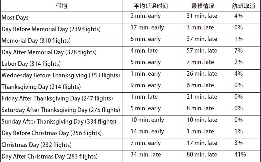 分析[5]:感恩节、圣诞节当天的飞机一般都会准点到达,但节日前后的延误情况是最严重的。圣诞节次日平均延误34分钟,最糟的情况是80分钟,还有41%的航班被取消。