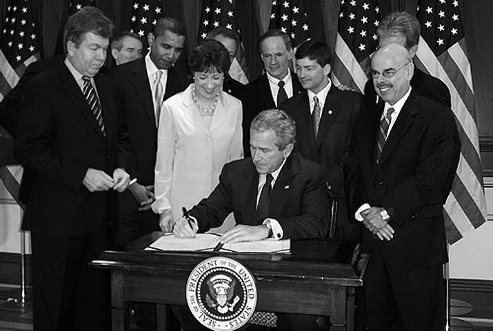 2006年9月8日,布什总统签署《科伯恩—奥巴马法案》,左三为奥巴马。(图片来源:网络)