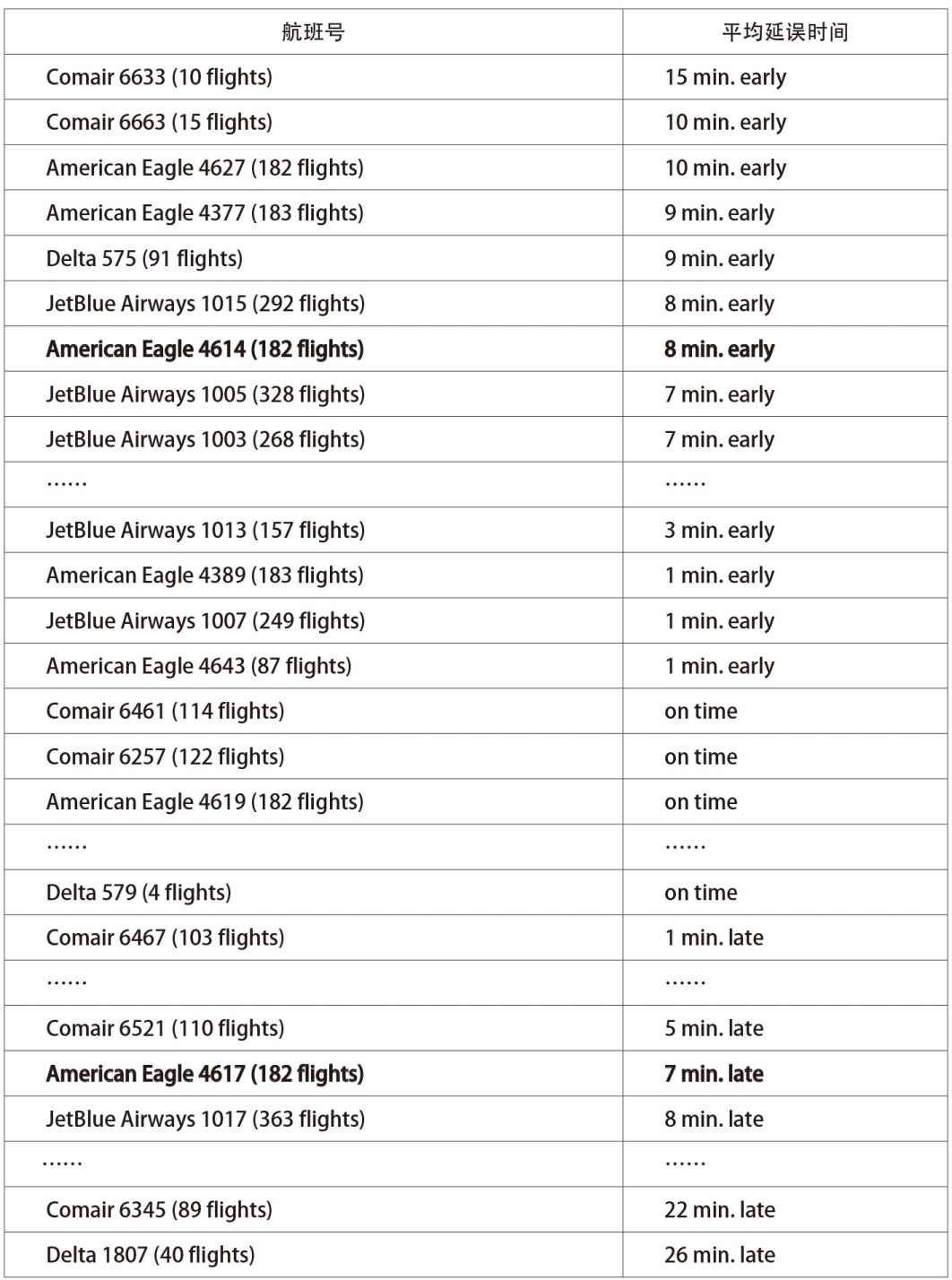分析[6]:全部航班的表现应有尽有。最准点的是航班Comair 6633,最不准点的是航班Delta 1807,平均延误26分钟。