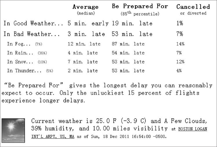 以波士顿至纽约的航线为例(起飞:Boston,Logan International;到达:New York,Kennedy International),在系统的主页上,输入机场名称,点击之后,用户可以看到不同天气、不同日期、不同时段、不同航空公司、不同航班等各种条件下飞机是否准时以及平均延误时间的数据明细。