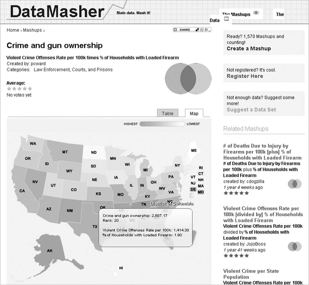 例如,一名用户以全美每个州为基准,整合了每百万人口发生犯罪案件的多少和各州居民拥有武器的比例两组数据,这两组数据分别来自联邦调查局和美国疾病控制中心(CDC)。下图表明,华盛顿居民的枪支拥有率为1.9%,远远低于全国平均水平,但其每百万人口的罪案数却为1414宗,居全国第一。又如密西西比州,其枪支拥有率为11.1%,居全国第二,但其每百万人口的罪案数却仅为291宗,在全国处于较低的水平。