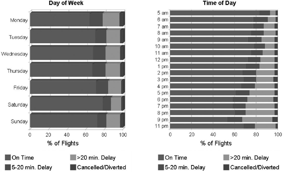 分析[4]:就一星期而言,星期六的准点率最高,为78%;星期一的准点率最低,为64%。就一天而言,每天早晨5点到6点起飞的航班准点率最高,为83%;晚上9点到10点的准点率最低,为53%。