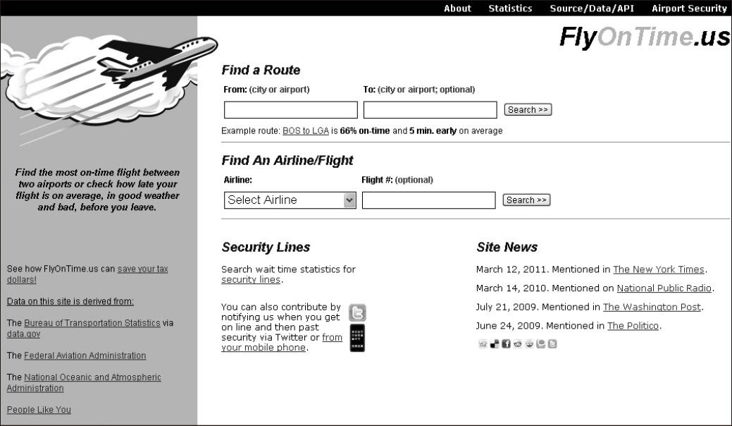 其实,为了缓解航班延误的问题,美国政府也想过同样的办法。早在Data.Gov之前,国家交通安全局就在其网页上(NSA.gov)提供过一个“航班等待时间计算器”,帮助旅客估计因航班延误而导致的等待时间。2009年政府开放原始数据之后,民间开发出来的这个免费工具明显比交通安全局提供的“计算器”功能更强大、界面更友好。很快,该局便关闭了这个“计算器”。
