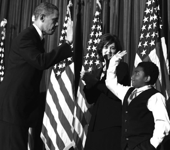 2010年3月21日,听到医保法案在众议院通过的消息,奥巴马和11岁的男孩欧文斯击掌庆祝。(图片来源:seattlepi.com,JEWEL SAMAD/AFP/Getty Images)