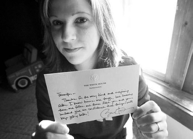“詹妮弗,谢谢你这封亲切和令人激励的来信。我知道时下生活艰辛,但是了解到你和你丈夫这样的人和事,给了我信心,我相信情况会不断好转!”
