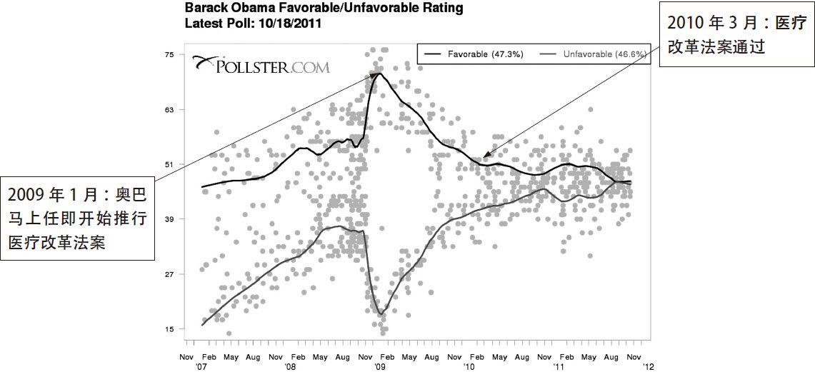 《赫芬顿邮报》将数十家专业调查机构对奥巴马支持率和反对率的调查结果绘成散点图,再根据这些点的分布确定其支持率和反对率的变化曲线。结果表明,正是在推行医疗改革法案的一年期间,奥巴马的支持率迅猛下降。