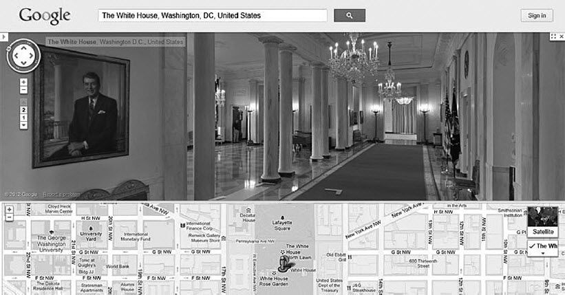 2012年4月,白宫和谷歌合作,将内部房间的实景进行360度立体拍摄,并放置在网上。(图为谷歌地图网站上白宫内部的截图)