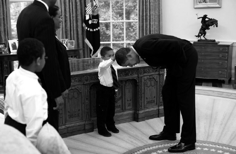 2009年5月8日,奥巴马邀请部分白宫工作人员的家庭成员访问白宫。其中一位小男孩非常好奇奥巴马的头发是不是和他的一样,奥巴马弯腰低头让他抚摸。(摄影: Pete Souza)