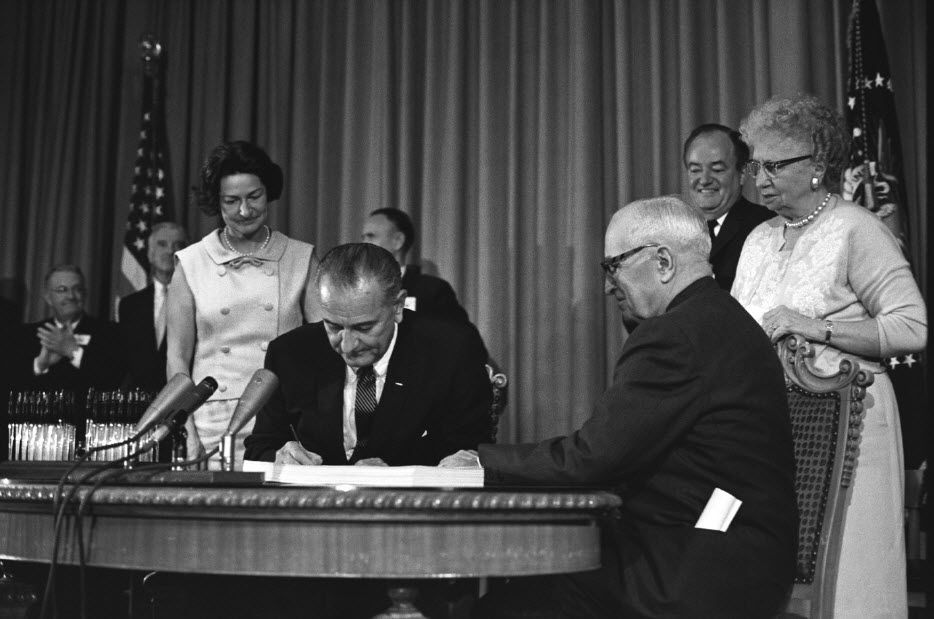 1965年7月,约翰逊总统举行隆重的仪式,签署了《医疗保障法》。为了纪念前总统杜鲁门对全民医保的开山之功,约翰逊在签署法案的同时,把第一张老人医疗保险卡授予了杜鲁门夫妇(图右部)。(图片来源:维基百科)