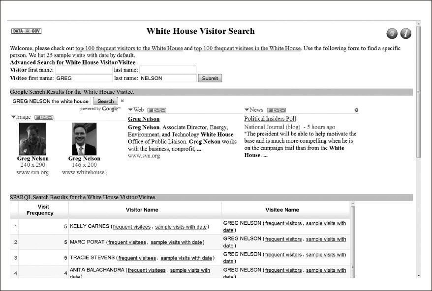 白宫访客记录的数据也很快就成为Data.Gov的一部分。没过多久,2010年4月,又有人利用这些数据在Data.Gov上开发了一个新的查询工具:白宫访客搜索(White House Visitor Search),这个工具,不仅可以按访问人、被访问人对原始数据进行查询,还利用语义网的技术,把相关人员的数据与其他网站的联接起来。