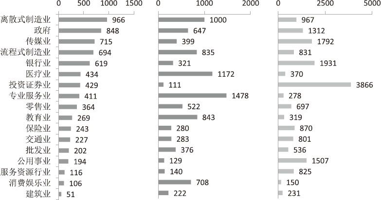 作为全世界馆藏量最大的图书馆,美国国会图书馆2009年拥有的电子信息总量为235太字节。从以下的图表可以看出:美国17个行业中,已经有15个行业大公司平均拥有的数据量超过了美国国会图书馆,其中投资证券业、银行业、传媒业位居前三位,都远远超过了美国政府。
