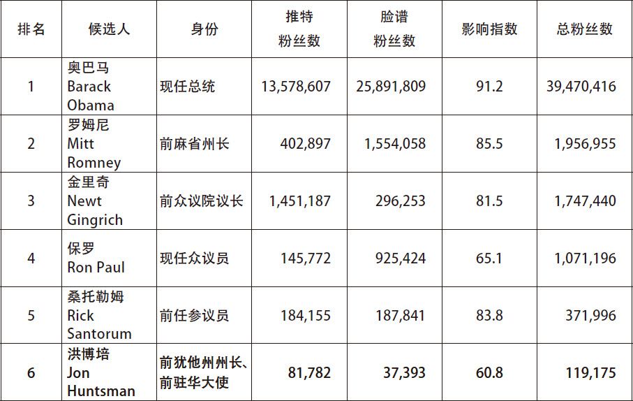 奥巴马已经铁定获得民主党的提名,他在网络的影响力也稳居第一,暂时无人可以超越。其他5位主要的挑战者均来自共和党阵营,其中前众议院议长金里奇是著名的《美国之约》的作者,在1995年曾率领共和党在众议院成功夺回失去了42年的控制权,其后才有本书第6章的掺沙子法案之争。至于前参议员桑托勒姆,他曾提出《国家天气服务职责法案》,反对免费发布天气的数据,这曾经在本书第5章提及。前驻华大使洪博培已经在2012年1月宣布退选。