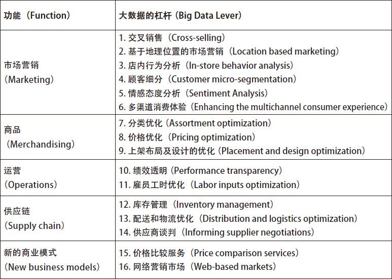 说明:麦肯锡公司认为大数据将在以上16个领域为零售业带来巨大的机遇,如果公司运用数据得当,零售商的营业利润将提高60%以上。(表格来源:Mckinsey Global Institute Analysis)
