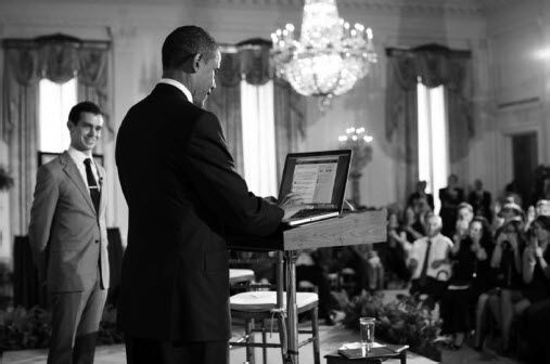 说明:2011年7月6日,奥巴马在白宫举行历史上首次推特会议。(图片来源:The Christian Science Monitor)