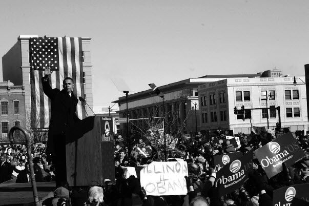 4年多以前,2007年2月,他在广场上的人潮中宣布了自己将参选总统的决定。作为代表伊利诺伊州的联邦参议员,他选择了位于该州首府的议会广场作为集会地点,这里曾经是林肯总统发表演讲的地方。奥巴马在凛冽的寒风中,面对沸腾的人群和高声喝彩,发表了近一个小时的演讲,随后开始了他长达一年多的大选征程。