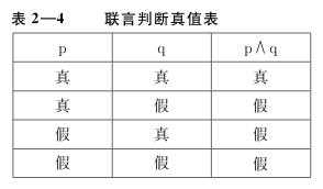 “p∧q”在p和q均为真时,是真的;在p为真q为假、p为假q为真或p为假q也为假时,是假的。该判断的真假情况可直观地反映在真值表中(见表2—4):