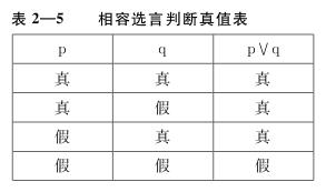 “p∨q”在p为真q为真、p为真q为假或p为假q为真时,是真的;在p和q均为假时,是假的。该判断的真假情况可直观地反映在真值表中(见表2—5):