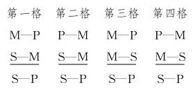 在三段论中,中项在大前提中既可能处在主项的位置上,也可能处在谓项的位置上,小前提中中项的位置也是如此,由此就形成了三段论的四类不同形式,我们称之为三段论的四个格: