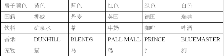 在一个小镇的街上,有五个具有五种不同颜色的房间。每个房间里分别住着一个不同国籍的人;每个人都在喝一种特定品牌的饮料;抽一种特定品牌的香烟;养一种特定的宠物;没有任意的两个人在抽相同品牌的烟、或喝相同品牌的饮料、或养相同的宠物。