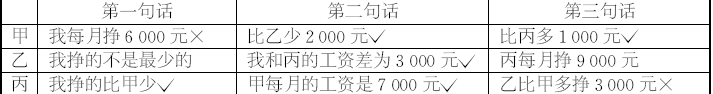 由此可知:甲说的“我每月挣6000元”是假话,“甲比乙少2000元”是真话。此时,丙说的“乙比甲多挣3000元”就是假话,因此,丙说的第二句话就是真话,即:甲每月的工资是7000元,从而推出乙的工资是9000元,丙的工资是6000元。