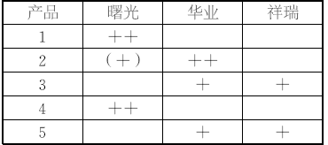 曙光厂擅长产品1、2、4;华业厂擅长2、3、5;祥瑞厂擅长3、5。由于1、4只有曙光厂擅长,故应安排曙光厂生产;又因为一个厂生产三种产品有问题,故产品2曙光厂不应生产,则只能由华业厂生产。这样用排除法可排除选项A、B、C、D,只有E符合。列表如下: