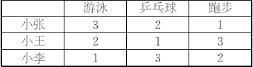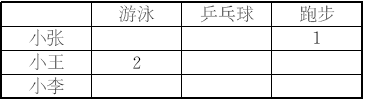 根据题意,上述表格的每行每列均为1、2、3三个数字。所以,小张游泳第三,乒乓球第二;小王跑步第三,乒乓球第一;小李游泳第一,乒乓球第三,跑步第二。如下图:
