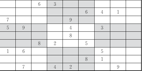 在9格宽×9格高的大九宫格中有9个3格宽×3格高的小九宫格,已经有一些数字在里面了(并非一定要采用数字,还可以采用字母a、b、c……),根据这些数字,在其他的空格上填入1到9的数字,但是要注意了,每个数字在每个小九宫格内不能重复,在大九宫的每行、每列也不能出现一样的数字。