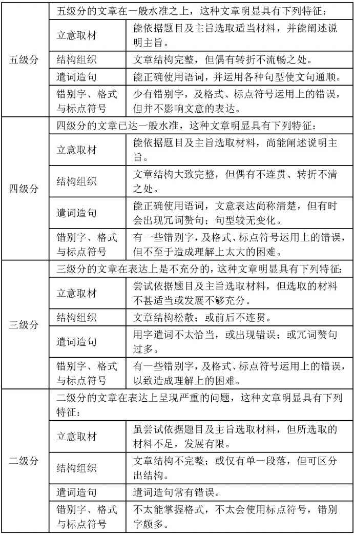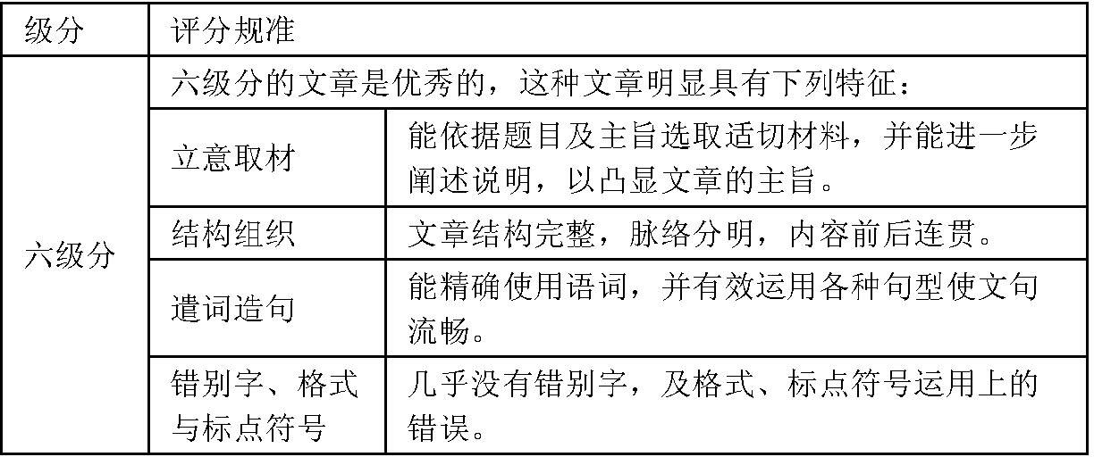 我的一位脸友(也曾是高中会考考生)庄子弘传来的作文六级分考评标准如此:
