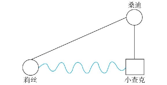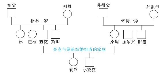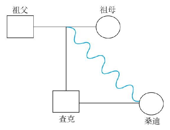在这幅家谱图中,最基本的三角关系是由三个家庭组成的:格林一家、怀特一家,还有查克·格林与桑迪·怀特组成的家庭。请注意,在这个三角关系中,查克和桑迪是三个家庭相互联系的纽带。但是不仅只有他们可以充当感情上的纽带,从而形成可能的同盟。在这个由13人组成的大家庭中,如果3人一组,就可以组成131个三角关系。再加上每个三角关系任意一方的位置都有可能进行相互转化,这样就可能有393种不同的角色。除此之外,还有其他类型的三角关系。比如祖父母处于三角关系的一方,查克处于另一方,而桑迪处于第三方。(图中的波浪线表示矛盾关系。)