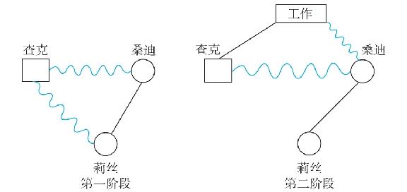 任何三个人在一起生活和相处时,都不可能从彼此之间得到相同的关怀和注意。莉丝从桑迪那里得到了足够的母爱和关怀,查克却感到自己受了冷落。此时,查克就像很多父亲一样,感到自己被排斥在了“圈外”(也就是三角关系中被疏远的一方)——桑迪不再像原来那样关心他,而他也开始有些怨恨莉丝。他感到嫉妒自己的女儿有些荒唐,也不能跟妻子交流此事。因此,他开始从工作和同事中寻求更多的关注和满足。(其他人也许会从宗教、酒吧,或者其他女人那里寻求满足。)这就形成了另外一种新的三角关系,其中包括查克的工作、查克,还有查克的妻子桑迪。在这个三角关系中,桑迪感到自己被排斥在外,被查克忽视了。这样一来,夫妻双方都感到自己被对方冷落了,都认为第三方(比如女儿莉丝,或者是查克的工作)夺走了自己本应得到的关爱,影响了夫妻双方的关系。