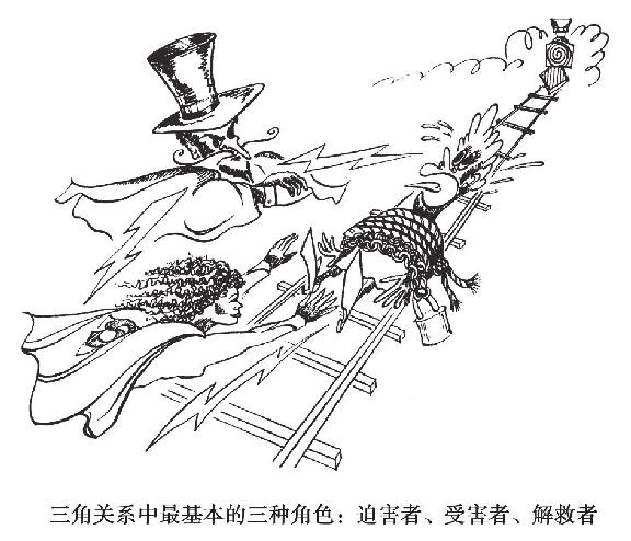 在三角关系及其内部的同盟之中,存在着三种最基本的角色:迫害者、受害者和解救者。在三角关系不断循环的过程中,这三个角色不一定会同时出现,但是整个过程之中肯定全部包含这三种基本角色。家庭中的每个成员在不同时期会扮演不同角色,原来的迫害者也许会转变为受害者或解救者。例如,在苏的案例中,当苏的父亲(迫害者)对母亲(受害者)发火时,母亲会泪流满面,在苏(解救者)的面前表现得很无助。在苏看来,父亲是在对母亲施暴。于是她过来解救母亲,攻击父亲,指责他太过专横。这样一来,苏自己又变成了迫害者,父亲则成了新的受害者。接着,母亲感到苏对父亲说的话太过分了,于是母亲又充当起了父亲的解救者和苏的迫害者。然后,苏对母亲发火,批评她不该太过软弱,而应该勇敢地站出来维护自己的权益。这样一来,苏又成了母亲的迫害者。接下来,父亲又来解救母亲,指责女儿不该那样对母亲说话,女儿又成了新的受害者。
