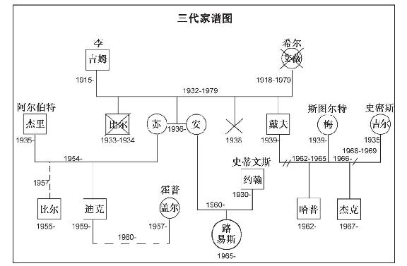 这是一个三代家谱图讲述的故事。吉姆·李出生于1915年。艾薇·希尔出生于1918年。1932年,艾薇与吉姆结婚,两人共生了四个孩子,还有一次不幸流产。第一个孩子比尔,出生一年后夭折;1936年一对双胞胎女儿出生;流产发生在1938年;小儿子戴夫出生在1939年。1979年艾薇去世,他们的婚姻就此结束。