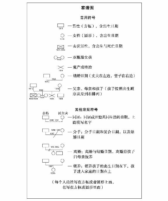因此,你首先必须了解家庭成员都包括谁,而最好的办法就是画一个家谱图。在之前的几章中,本书已经举出过家谱图的例子。它是家庭成员的图形记录,是了解家庭历代成员及其关系的好方法。