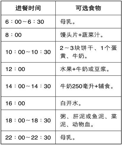 〖提醒〗宝宝每日应喂鱼肝油1~2滴,14:00~14:30这个阶段的辅食量要逐渐增多,直到9个月。每天要保证1~2瓶牛奶和豆浆,点心可适量吃些,粥可吃1小碗(如果有牛奶就吃半小碗)。